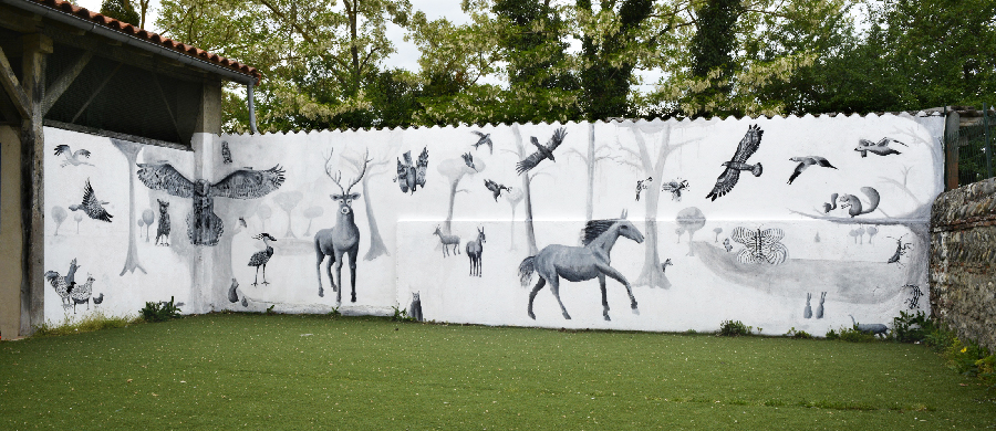 A partir d'un recensement des espaces animales présentes sur le territoire, Yo-Yo Gonthier a proposé à un groupe d'enfants des ateliers de dessins d'animaux au stylo bille. Après huit séances de travail, ils sont passés à la réalisation d'une fresque dans la cour de l'ALAE (périscolaire). Chaque enfant a reproduit un ou plusieurs animaux au fusain puis à la peinture et Yo-Yo Gonthier, qui a réalisé lui aussi plusieurs figures, a en parallèle retouché l'ensemble pour unifier ce projet mené à 30 mains. Marie guéret, Les chemins.