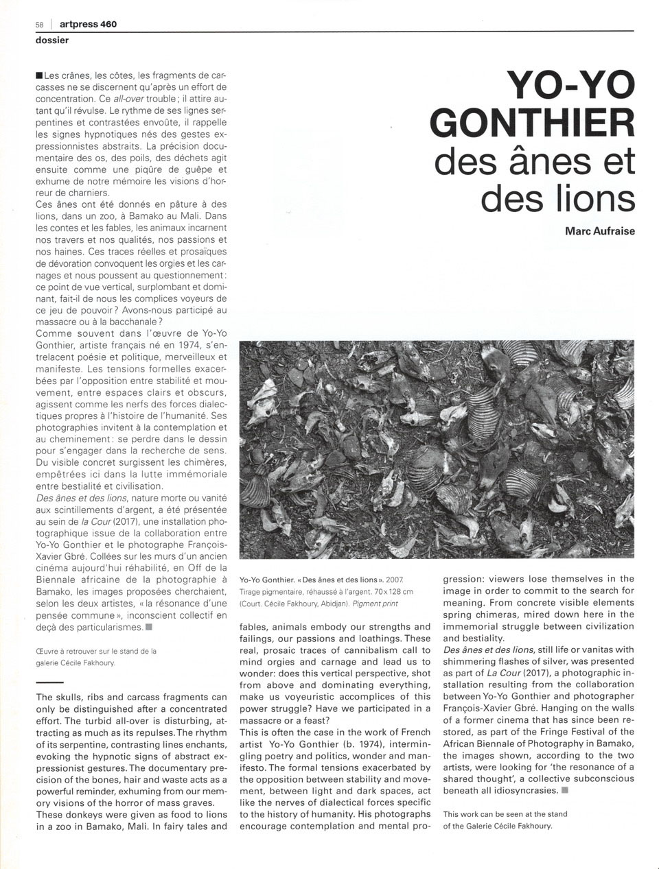 Art press N°460 Novembre 2018 Yo-Yo Gonthier, Des ânes et des lions Focus Paris photo 2018 Grand Palais, Un article de Marc Aufraise, Comme souvent dans l'oeuvre de Yo-Yo Gonthier, artiste français né en 1974, s'entrelacent poésie et politique, merveilleux et manifeste. Les tensions formelles exacerbées par l'opposition entre stabilité et mouvement, entre espaces clairs et obscurs, agissent comme les nerfs des forces dialectiques propres à l'histoire de l'humanité. Ses photographies invitent à la contemplation et au cheminement : se perdre dans le dessin pour s'engager dans la recherche de sens. Du visible concret surgissent les chimères, empétrées ici dans la lutte immémoriale entre bestialité et civilisation. (...) (extrait) Lire l'article entier dans la rubrique Textes